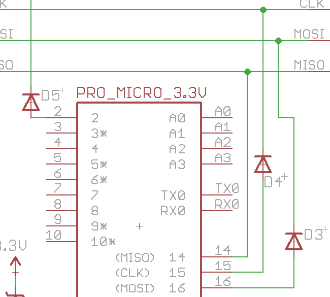 My third attempt involved using diodes to clamp the SPI lines to the Arduino’s Vcc, similar to the circuit here: http://electronics.stackexchange.com/a/22773/2473. This didn’t solve either problem.