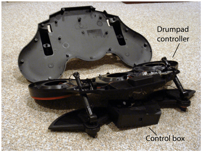 - Turn the drumpad over and carefully remove the screws, saving the three that attach the control box to the drumpad controller for last. When you remove them, use one hand to keep the control box from falling out.