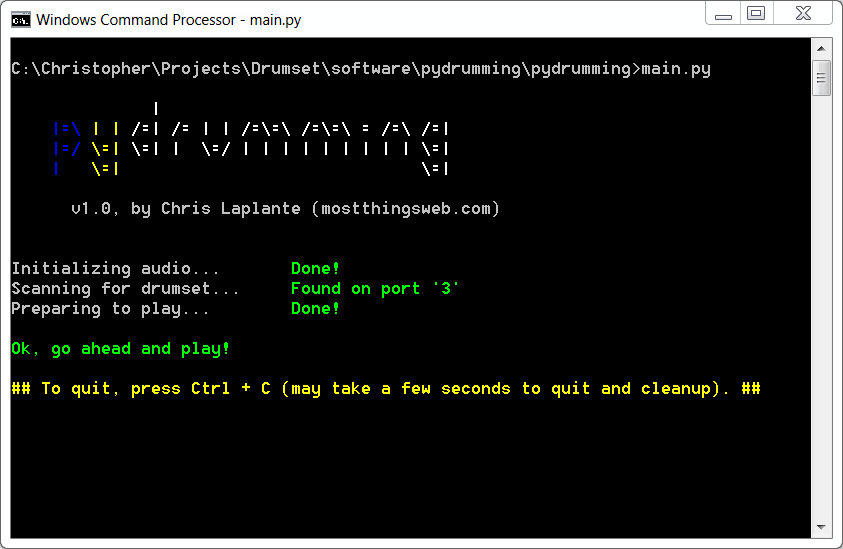 softwarepydrummingand, at your command prompt, runsetup.py install. pydrumming.exe(a different file extension on Linux and OSX, naturally) will be generated atC:Python27Scripts, or wherever your version of Python lives.